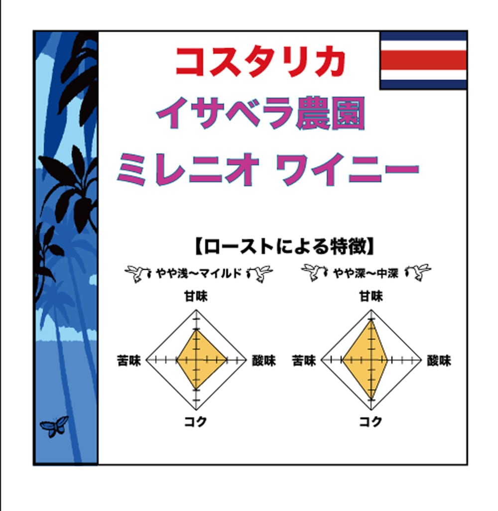 原産国:コスタリカ 生産地域:トレスリオス地区ドゥルセノンブレ 農園名:イザベラ農園 生産者:カストロ家 標高:1,600m スクリーン:5UP 規格:SHB-EP 栽培品種:ミレニオ 精製方法:ナチュラル 印象:ワイニーと呼ぶにふさわしい芳醇な香りと、強烈なワイン感。 余韻に残るマウスフィールをどうぞお召し上がりください